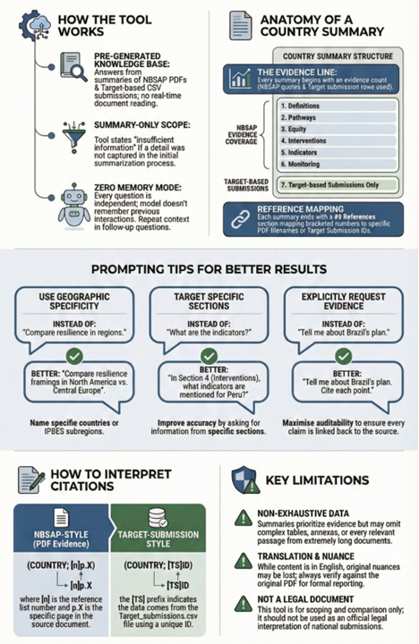 Resilience is central to global biodiversity policy. The web application below uses AI-assisted analysis to help you explore how Parties define and frame “resilience" (resilience of what, to what, for whom, by which mechanisms and over what timeframe), along with intervention priorities, and governance and equity considerations in formal submissions to the Kunming-Montreal Global Biodiversity Framework (KMGBF).
